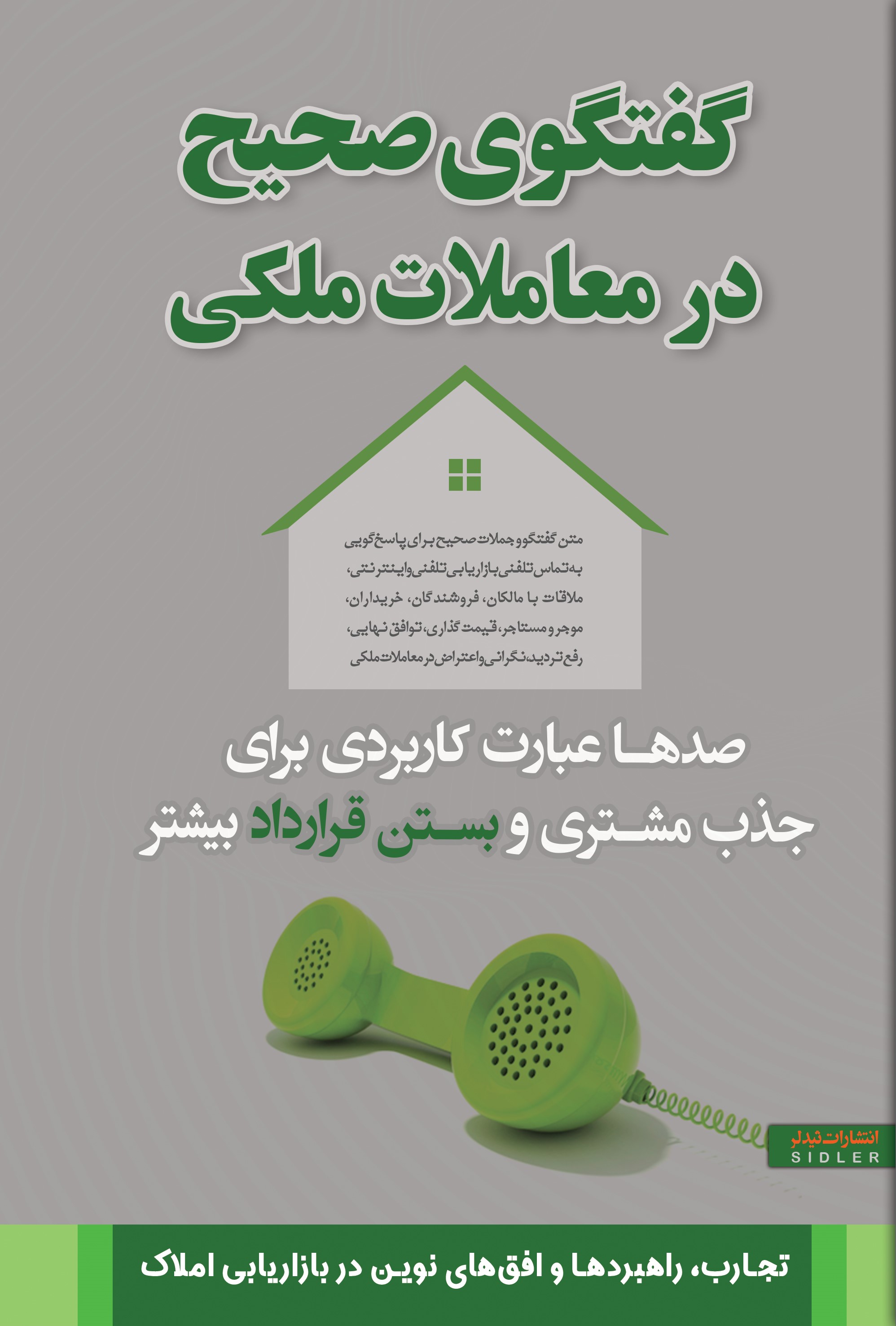این کتاب برای مشاوران و کارگزاران املاک نوشته شده است تا به آنها در ارائه حرفهای شغلشان کمک کند. املاک صنعتی است که برای بالا بردن کیفیت ارایه خدمات نیاز به تاثیرگذارترین گفتگوها را دارد. گفتگوی صحیح به مشاوران و کارگزاران حرفهای اجازه میدهد ارزش کارشان را به مشتریان نشان دهند و به آنها قدرتی برای موفقیت در کارشان میدهد.پرسیدن سؤالات بسیار و گوناگون ترفندی مناسب برای حل مسائل و مشکلات است. هوش و استعداد در برقراری ملاقاتهای کاری از پرسیدن سؤالات زیاد سرچشمه میگیرد. توانایی پرسش سؤالات تنها از طریق گفتگوهای خاص و تمرینات بسیار افزایش پیدا میکند. کلمات کلیدی: املاک و مستغلات - مشاوران املاک - مدیران املاک - کارگزاران املاک - مکالمات - پاسخگویی - گفتگو - تماس - بازاریابی تلفنی - پاسخگویی صحیح - نظرسنجی - -متن گفتگو - خانه به خانه - فرد خاص - ملک خاص - -پیش فایل - فایل - صلاحیت - قیمتگذاری - رفع نگرانیها و اعتراض - توافق نهایی - قولنامه - نشان دادن خانه - مشتری - مشتری به بیرون - مشتری FSBO - خریداران - خریدار - فروشنده - فروشندگان